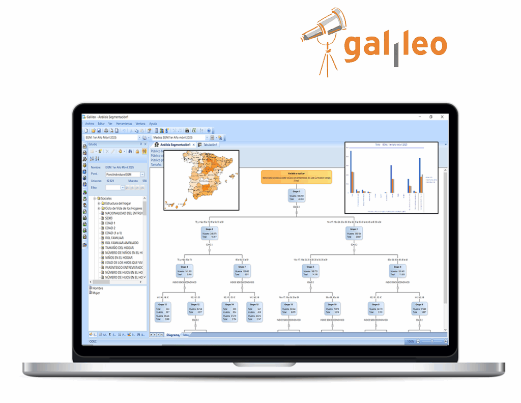 - Investigar, analitzar y planificar mitjans: Qualsevol campanya de publicitat pot ser creada, investigada i analitzada mitjançant els mòduls inclosos en Galileu: